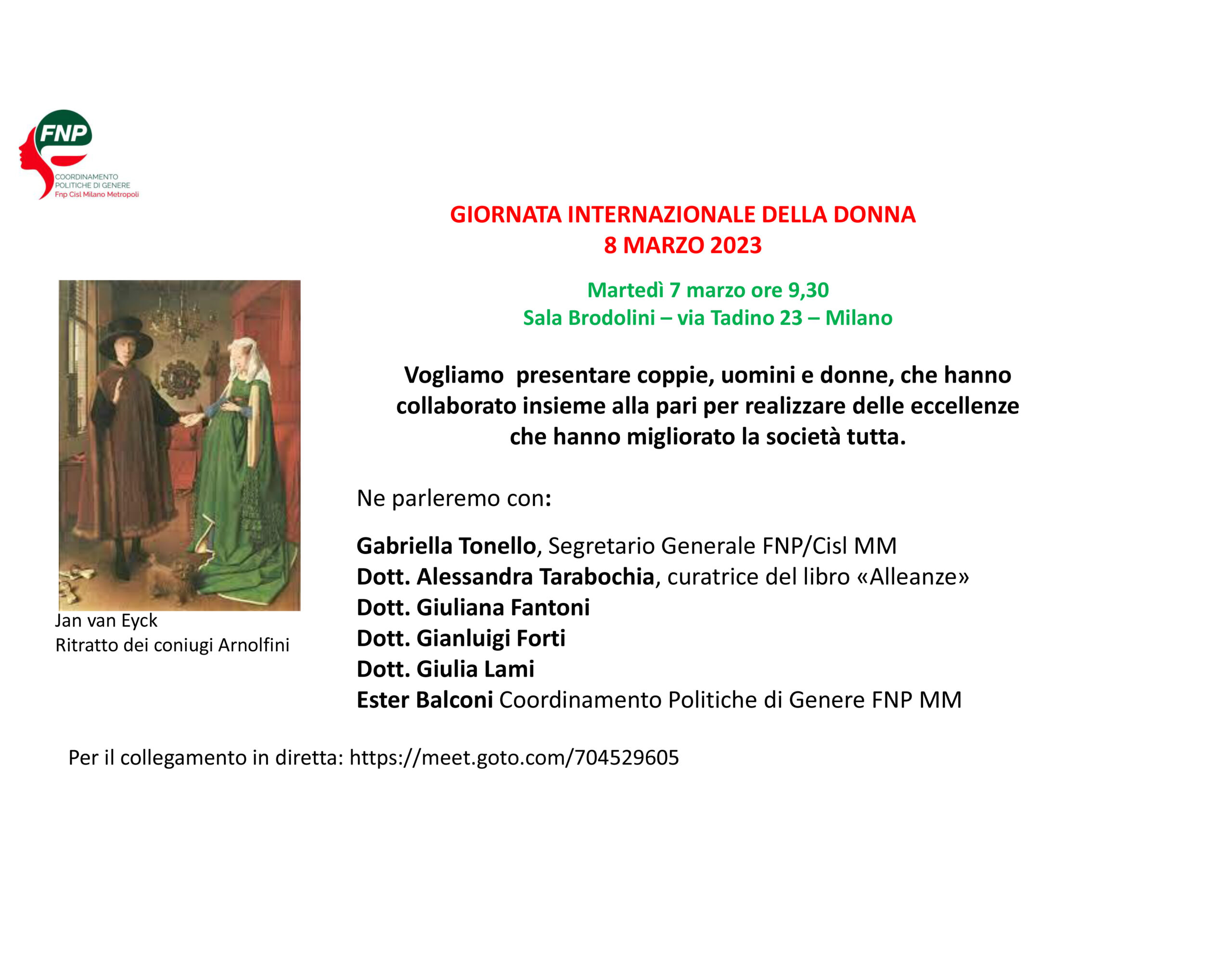 L’incontro del 7 marzo prossimo, in occasione della Giornata internazionale della donna, organizzato dal Coordinamento politiche di genere della Fnp a Milano, in via Tadino, parlerà di alleanze. Alleanze tra uomini e donne, sodalizi intellettuali, progetti di vita, condivisione di valori e battaglie che hanno dato luogo a risultati importanti, nella scienza, nella cultura, nella politica. È da una prospettiva originale che il coordinamento della Federazione dei pensionati Cisl milanese ha scelto di ricordare, in prossimità dell’8 marzo, i valori della parità di genere, a partire da un libro: a cura di Alessandra Tarabochia, titola “Alleanze. Storie di uomini e donne che hanno sparso semi di luce” – edizioni Prometheus – e raccoglie testi di Giuliana Fantoni, Gianluigi Forti, Giulia Lami, Giovanna Carocci, Maria Luisa Eguez, Maria Fratelli, Luciana Migliore, Daniela Notarfonso, Alessandro Pontremoli, Piercarlo Sacco e Giancarlo Zappoli.