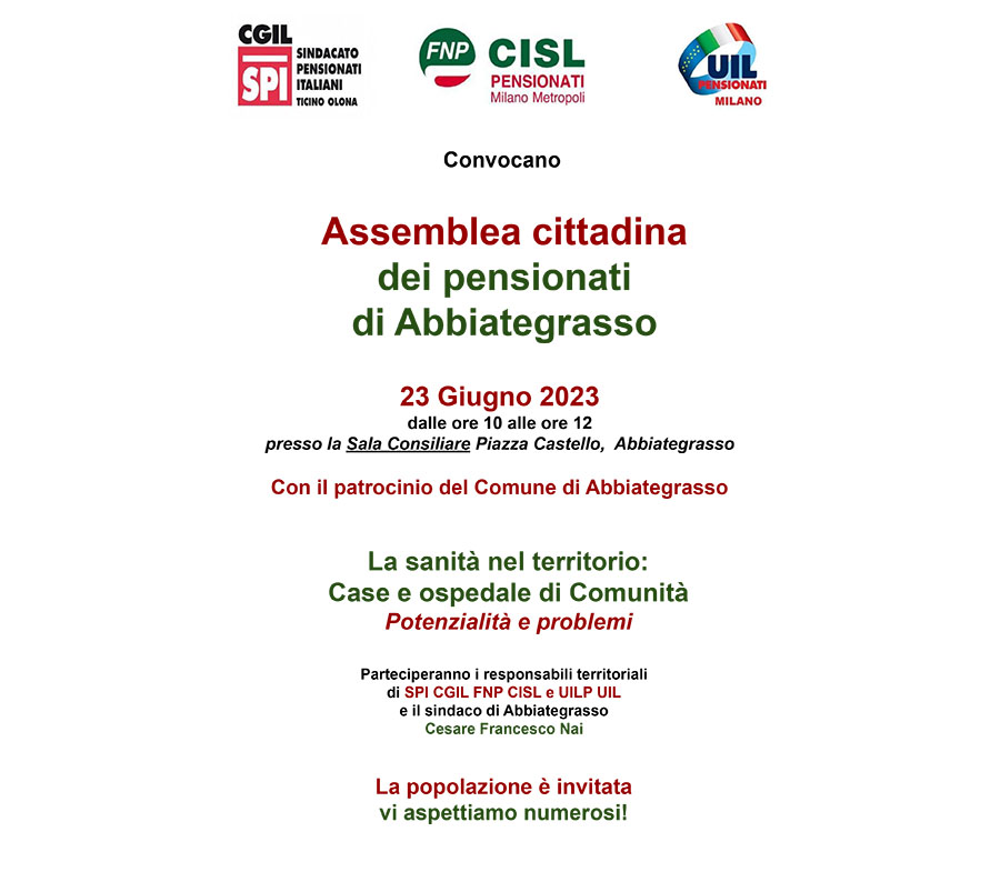 Ad Abbiategrasso c’è preoccupazione, da parte dei sindacati dei pensionati e dei cittadini, per i tempi di realizzazione della riforma sanitaria, delle previste case di Comunità e dell’ospedale di Comunità. I dubbi sono emersi venerdì 23 giugno, nel corso dell’assemblea cittadina dal titolo “La sanità nel territorio: case e ospedale di Comunità. Potenzialità e problemi”, organizzata da Spi Cgil, Fnp Cisl e Uilp Uil nella sala consiliare.